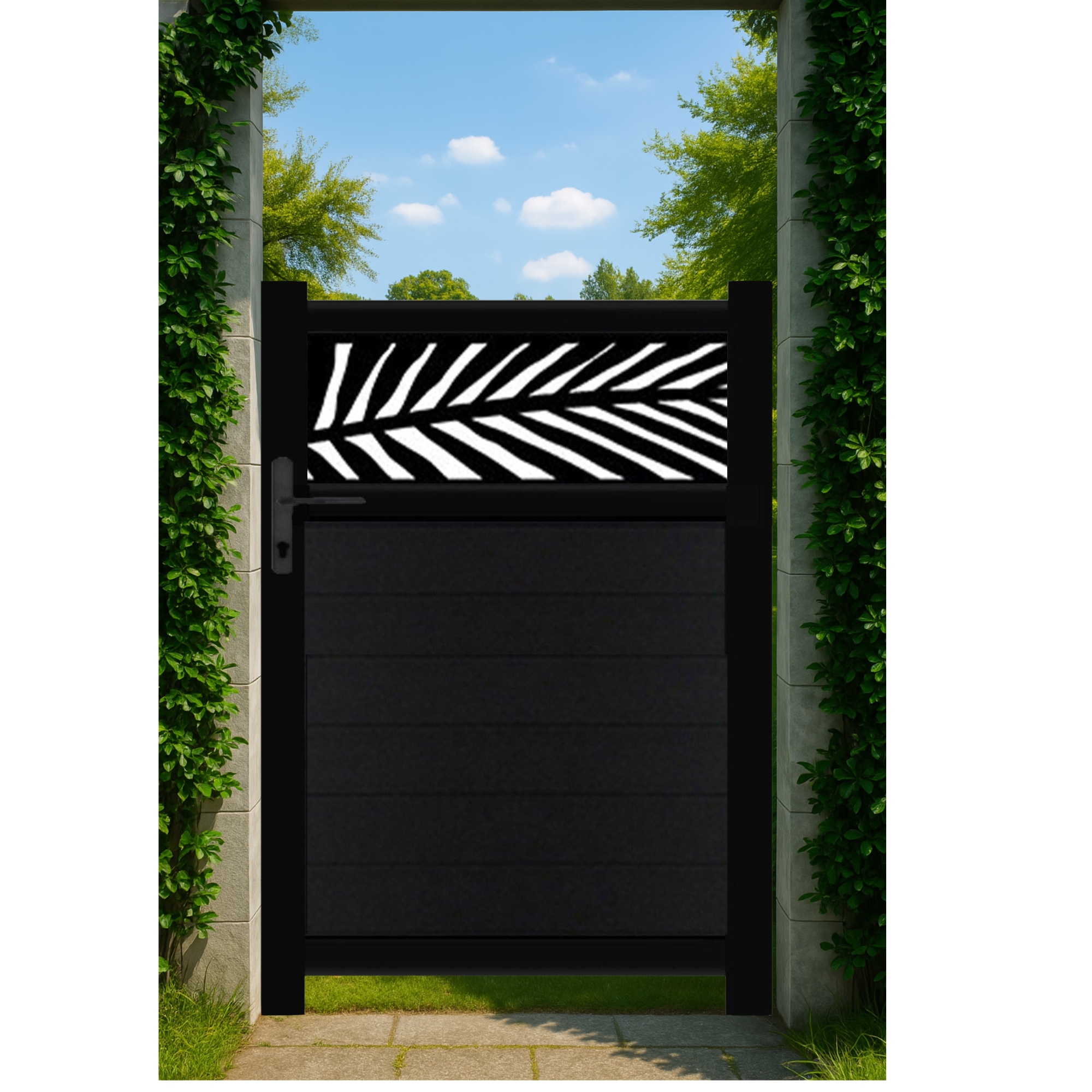 Stunning trellis gate designed to gather both privacy and style with the opacity of the door and the cut designs on top. The "Frond" design is one of our most recent ones. Bang on-trend, it captures the move towards maximal botanicals perfectly. Zero maintenance, like everything we do!