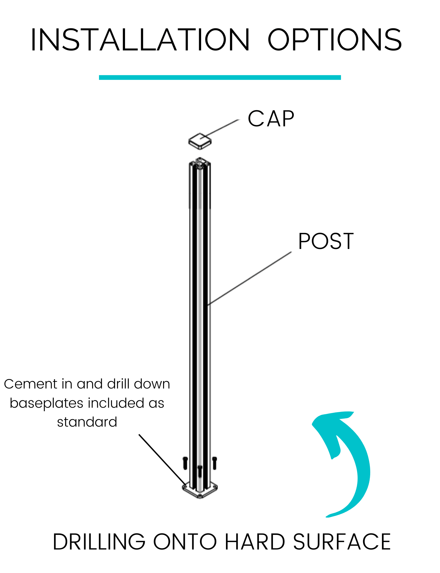 • Choose which of our post bases work for your surface. We offer fence posts that can be set into concrete, or drilled onto a hard surface, simply choose from the drop-down menu.