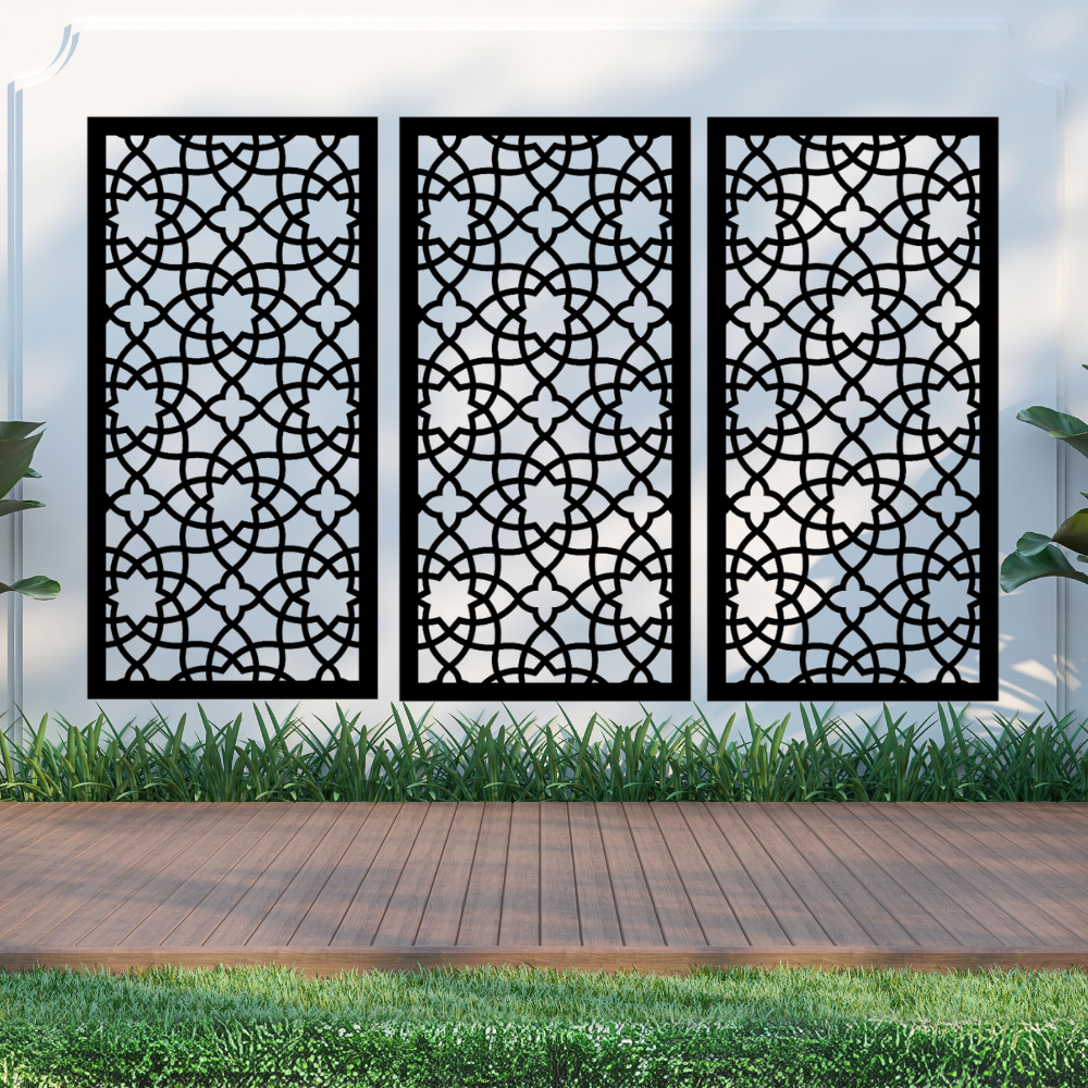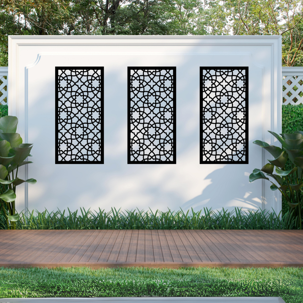 Inspired by the intricate window patterns of Arabic and Andalusian architecture, the Alhambra design blends geometric symmetry with soft floral influences, creating a striking balance between traditional craftsmanship and modern outdoor living. The detailed pattern allows light and airflow to pass through while helping to define boundaries, seating areas, and feature walls with a sophisticated decorative finish.