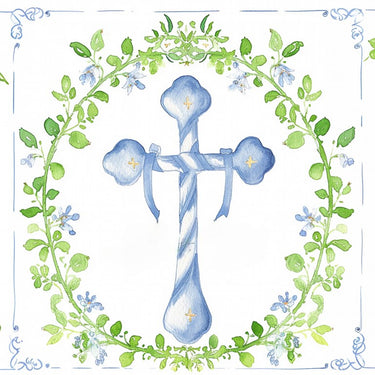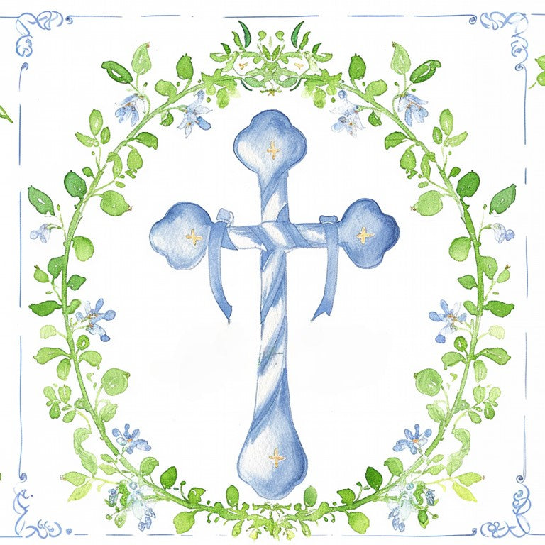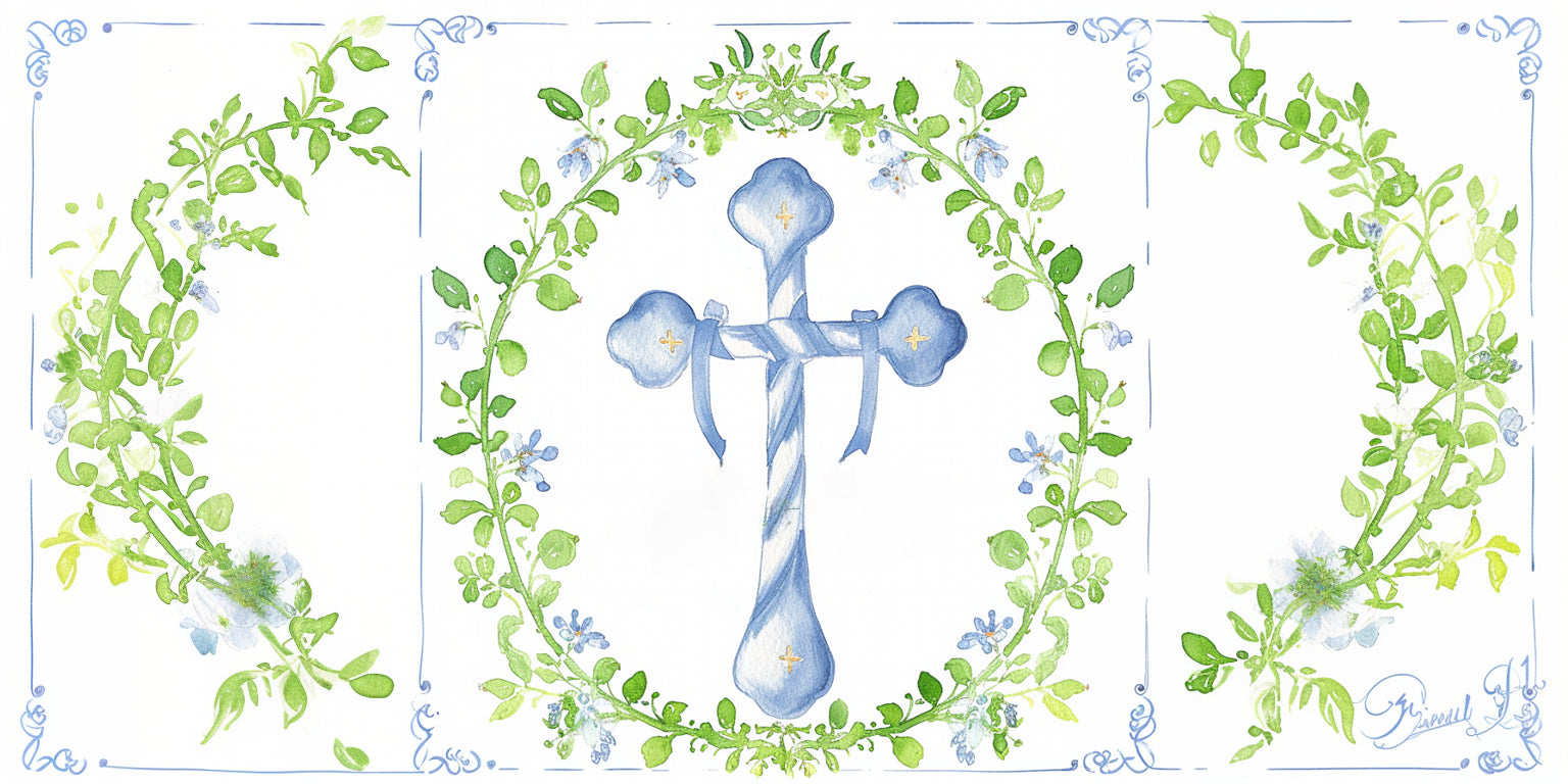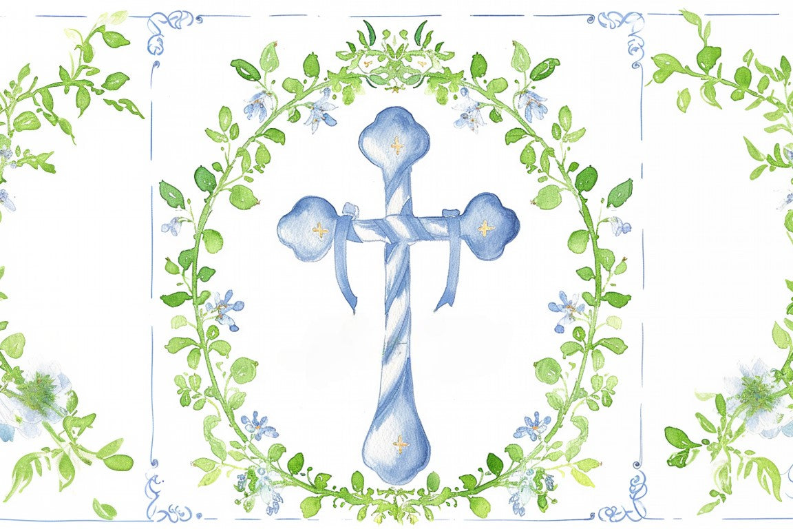 Blue Crucifix Fence Wallpaper presents a serene watercolour cross encircled by gentle botanical foliage, creating a calm and symbolic design suited to sacred moments and peaceful decorative spaces. Soft blue tones paired with fresh greenery evoke purity, hope and quiet reflection.