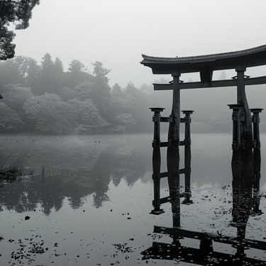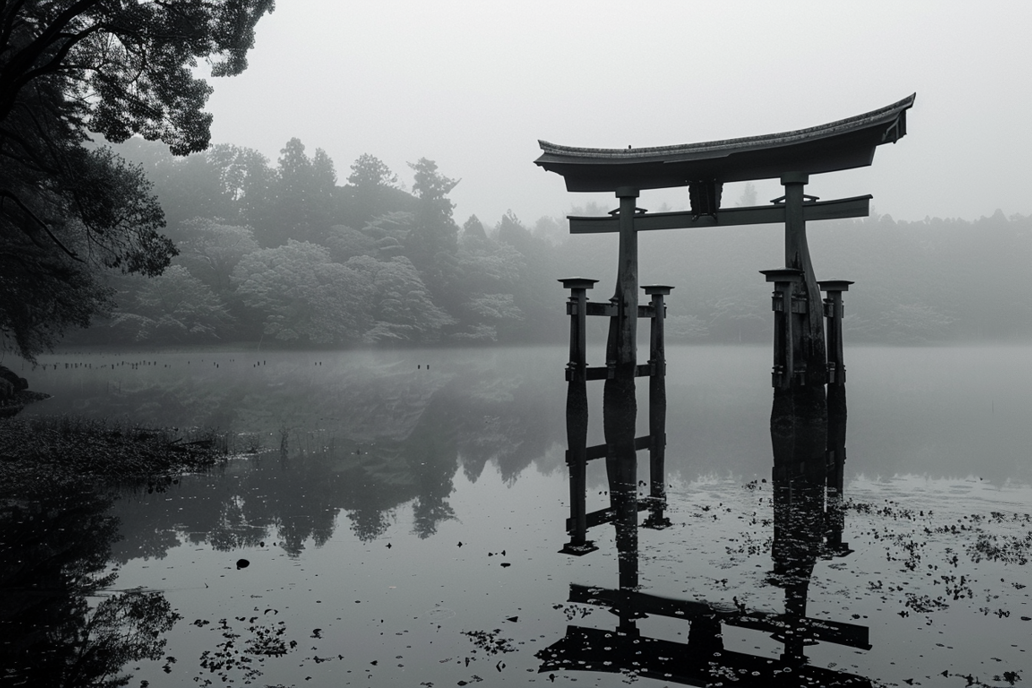 Rooted in Japanese symbolism, the torii gate represents transition, peace and spiritual balance. Torii Fence Wallpaper captures this essence through a minimalist composition of still water, mist-covered trees and architectural form.