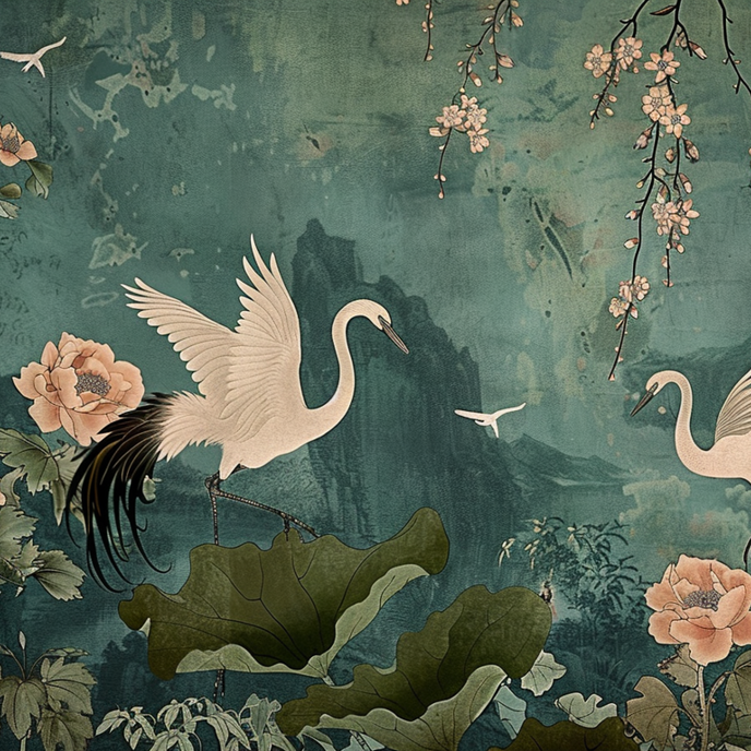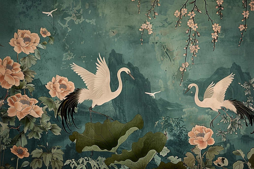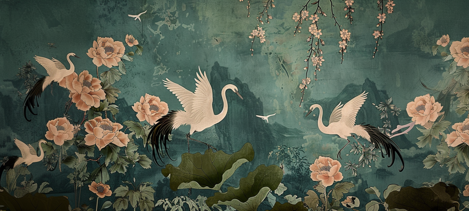 Symbolising longevity, peace and harmony, the crane—Tsuru—is central to this beautifully balanced design. Tsuru Fence Wallpaper blends classical illustration with a rich, painterly background, creating depth and movement without overwhelming the space.