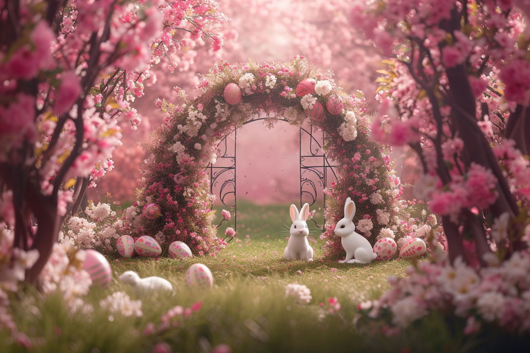 Bunny Bliss Easter Fence Wallpaper captures the joy of springtime with delicate blossom trees, a floral garden arch and sweet white rabbits surrounded by pastel Easter eggs. The dreamy pink tones and soft natural textures create a warm, magical atmosphere perfect for seasonal gatherings and children’s celebrations.