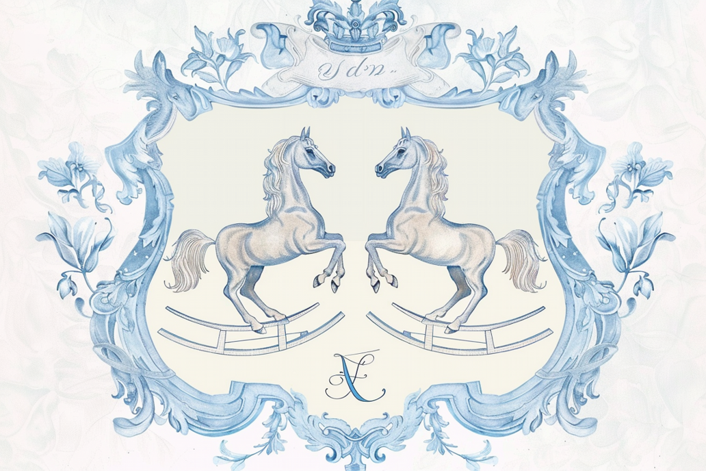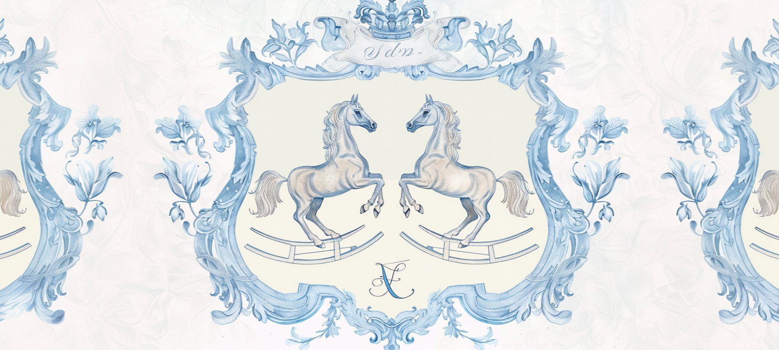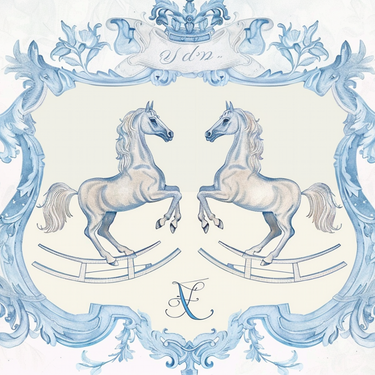 Inspired by traditional heritage illustrations and rocking-horse motifs, Baby Boy Stallion Monogram Fence Wallpaper blends innocence with classic elegance. Twin stallions framed by ornate detailing create a balanced, ceremonial composition, while a central monogram adds a bespoke, personal touch.