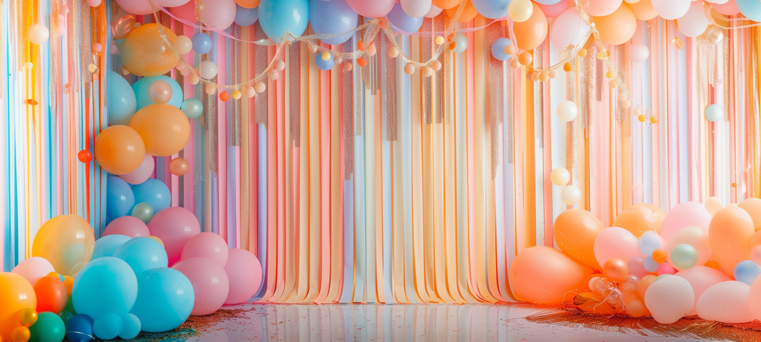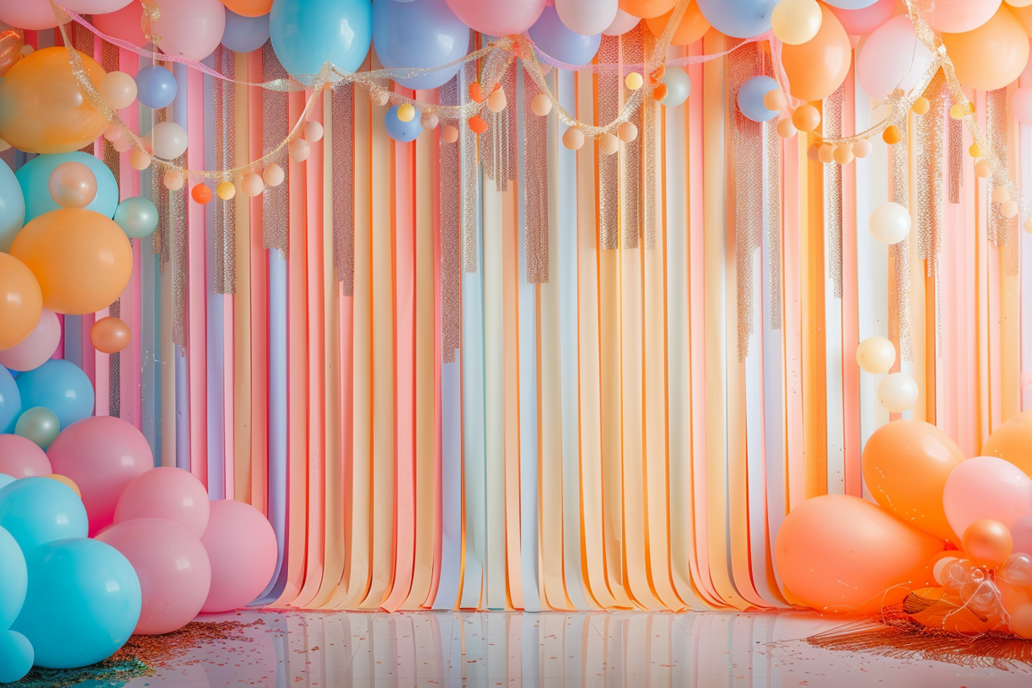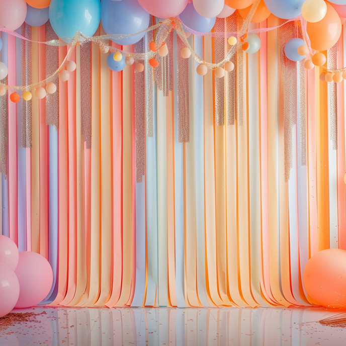 Designed to capture the spirit of celebration, Birthday Balloon Fence Wallpaper blends playful colour with a polished, contemporary aesthetic. Floating balloons in soft peach, blush, blue and ivory tones are layered against a flowing striped backdrop, creating depth, movement and visual impact without overwhelming the space.