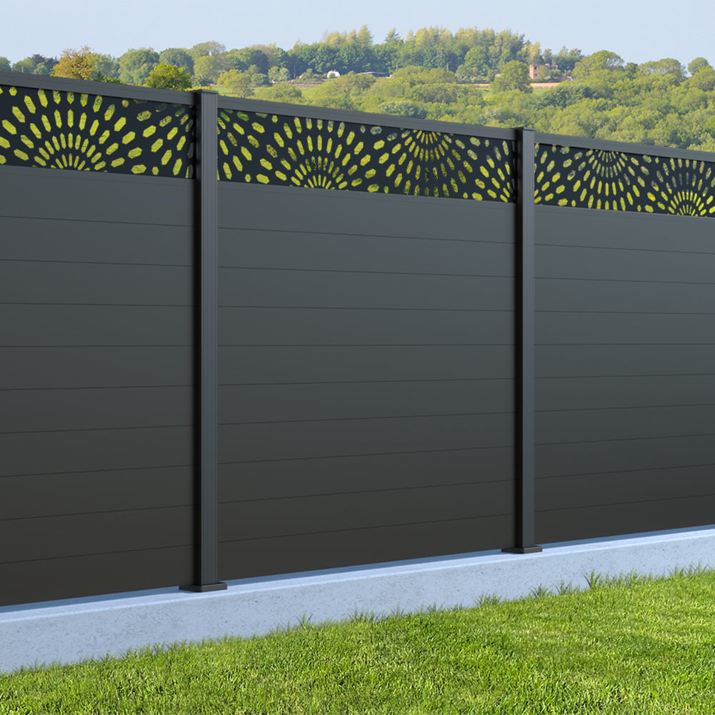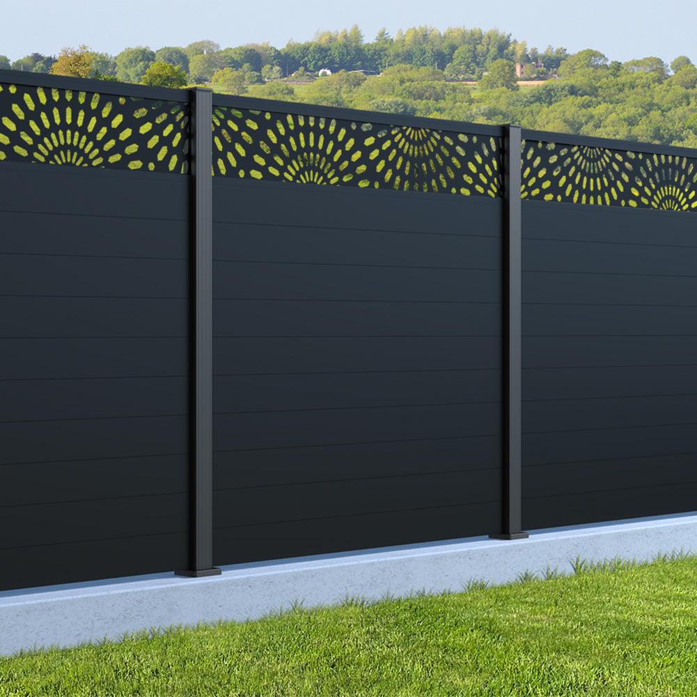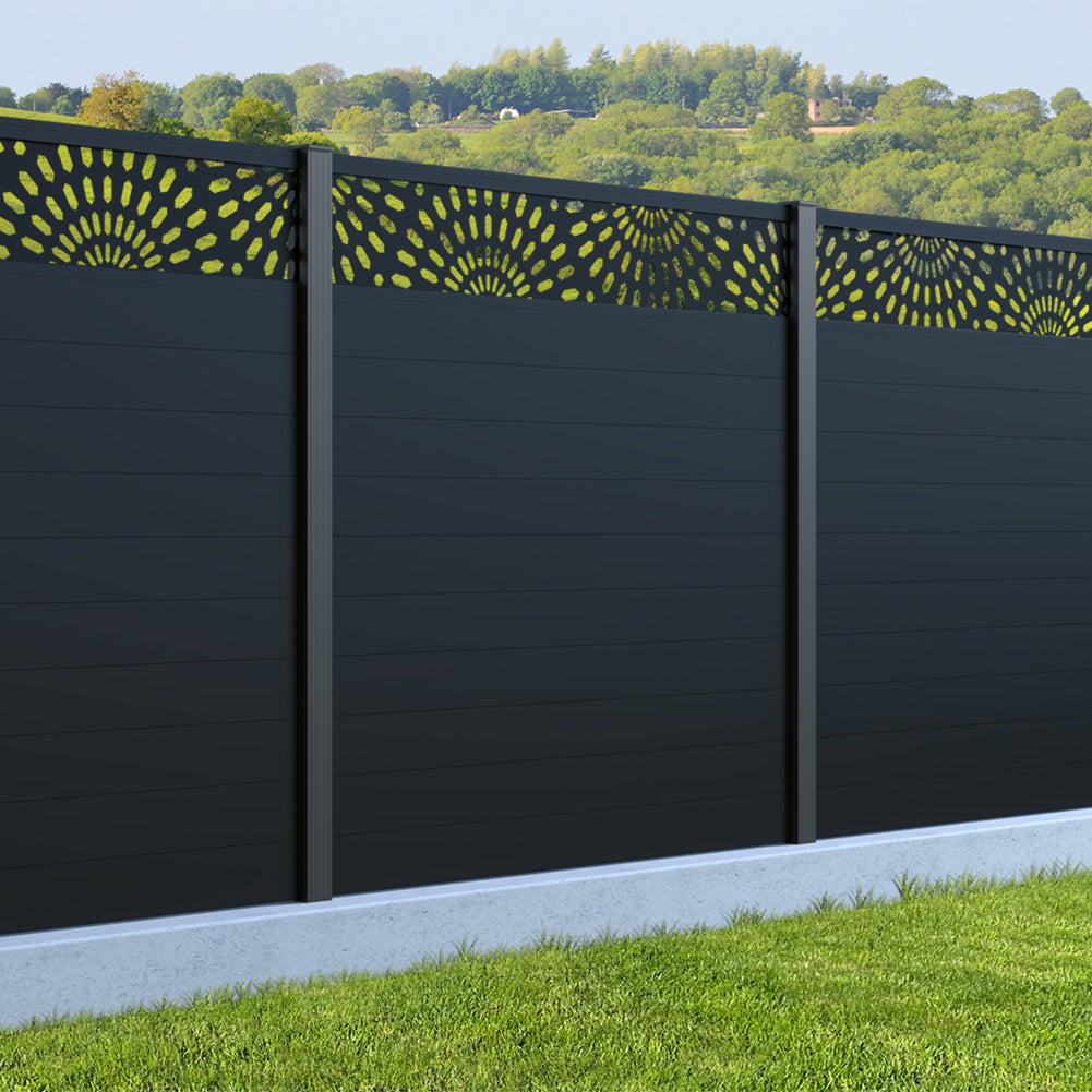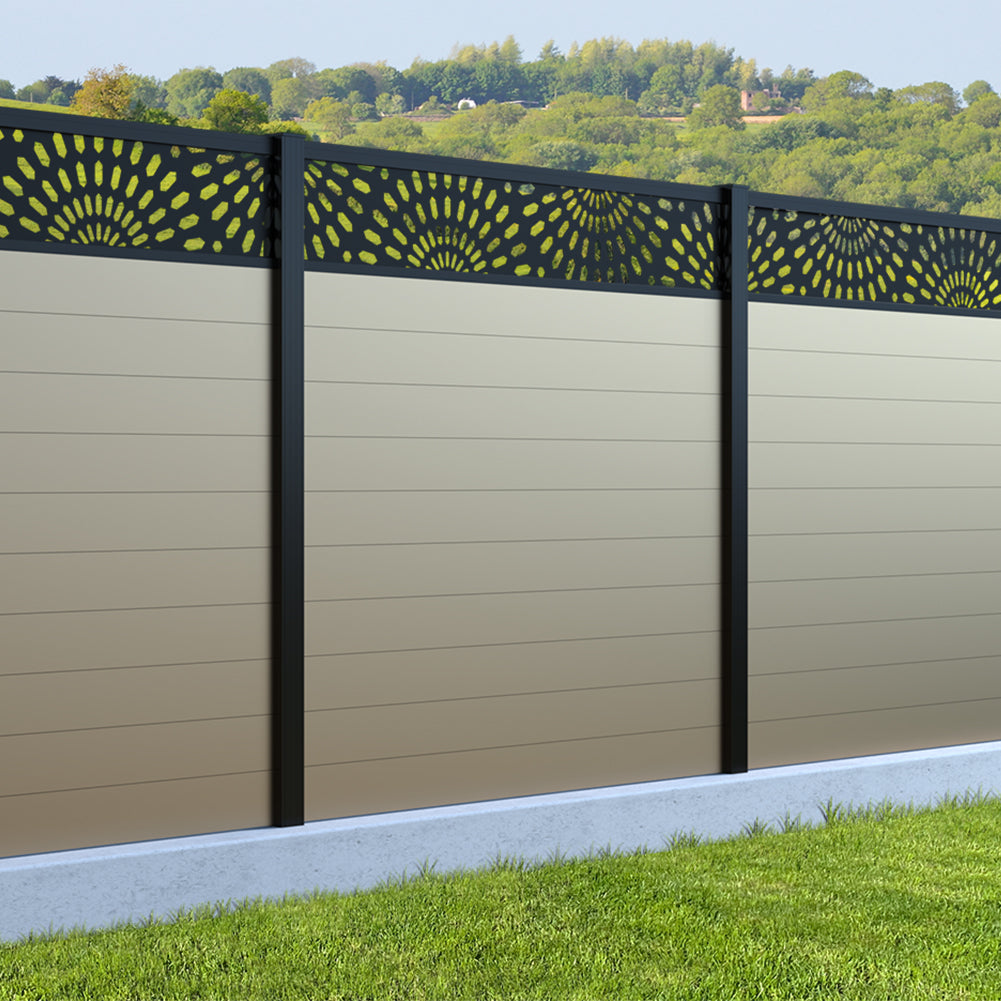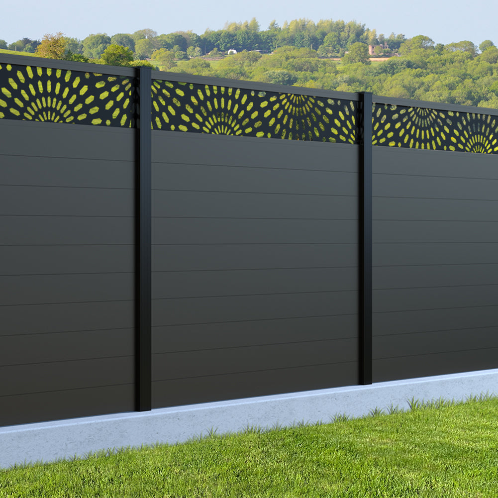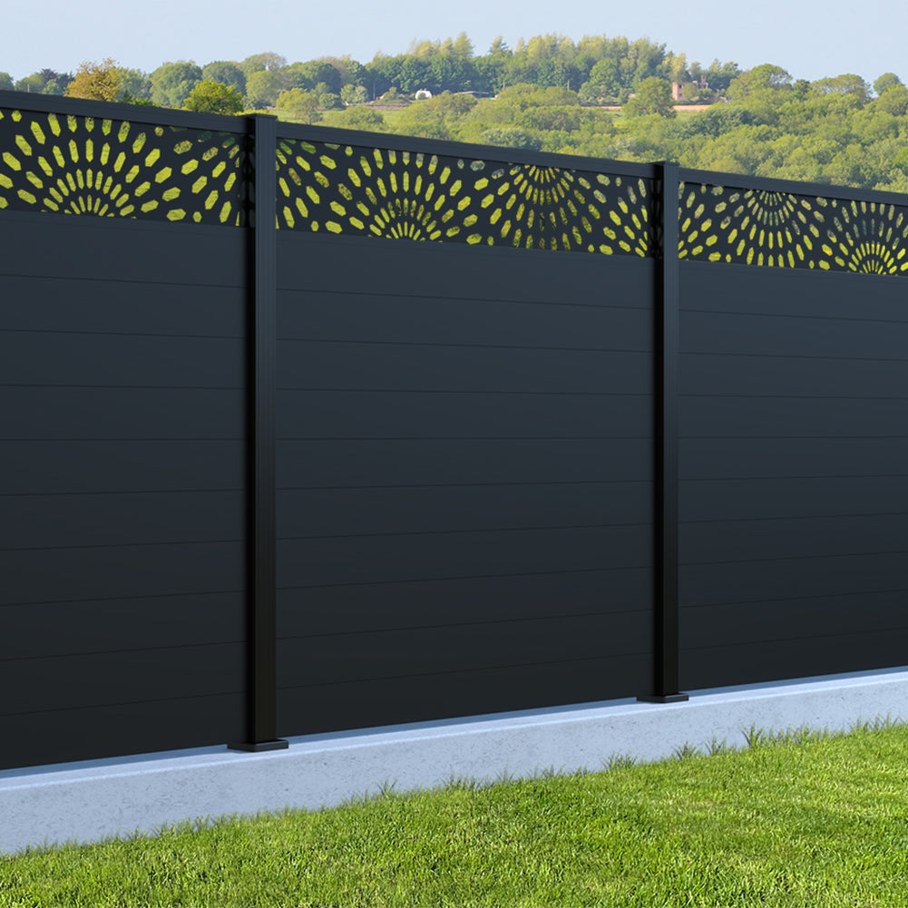 Fence your garden in style with our Sunburst Trellis Aluminium Fence Panels. Designed for modern outdoor spaces, this decorative aluminium garden fencing combines sleek horizontal boards with a stylish laser cut sun design to create a contemporary and private garden boundary.