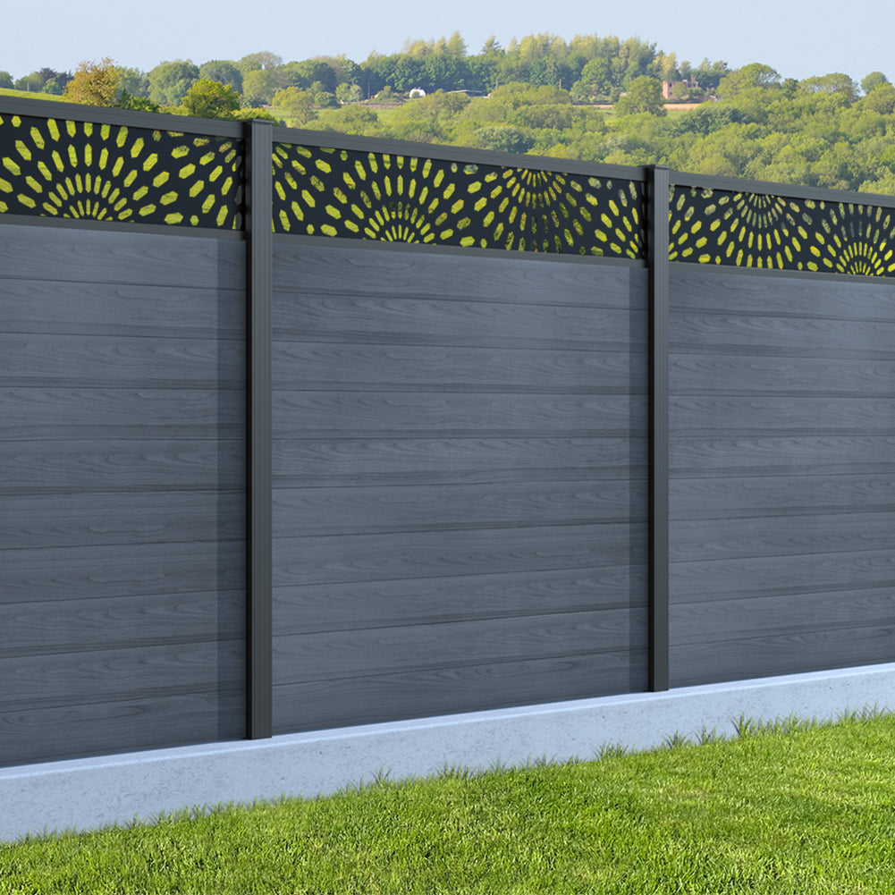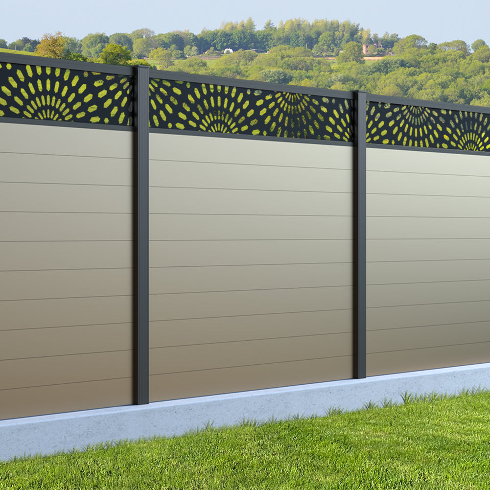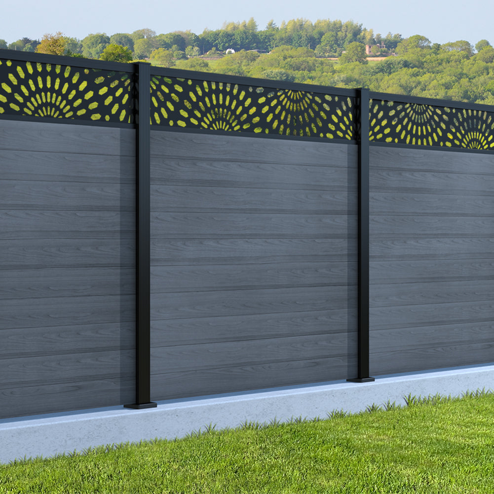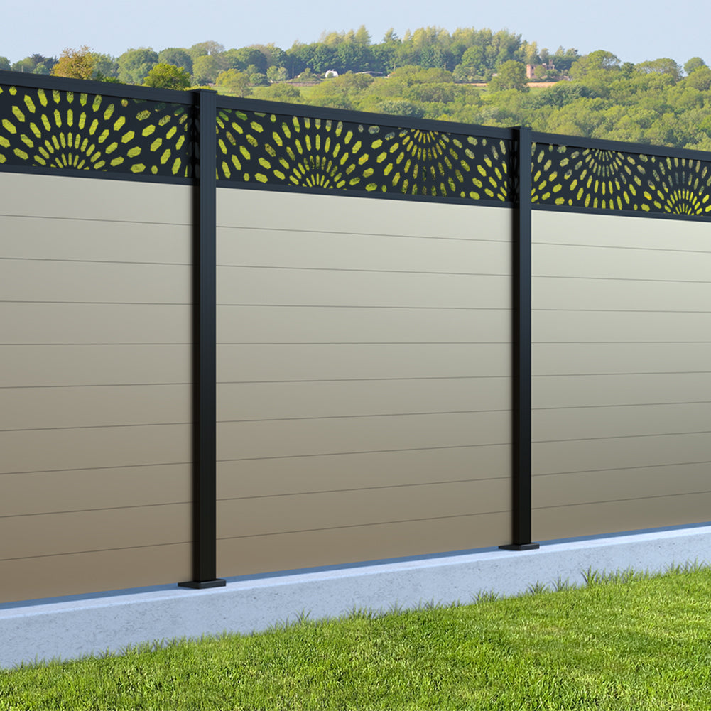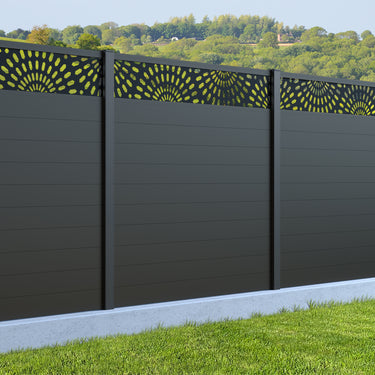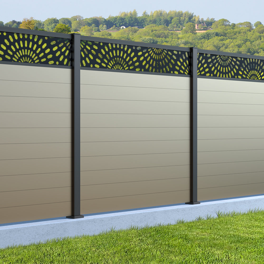 Fence your garden in style with our Sunburst Trellis Aluminium Fence Panels. Designed for modern outdoor spaces, this decorative aluminium garden fencing combines sleek horizontal boards with a stylish laser cut sun design to create a contemporary and private garden boundary.
