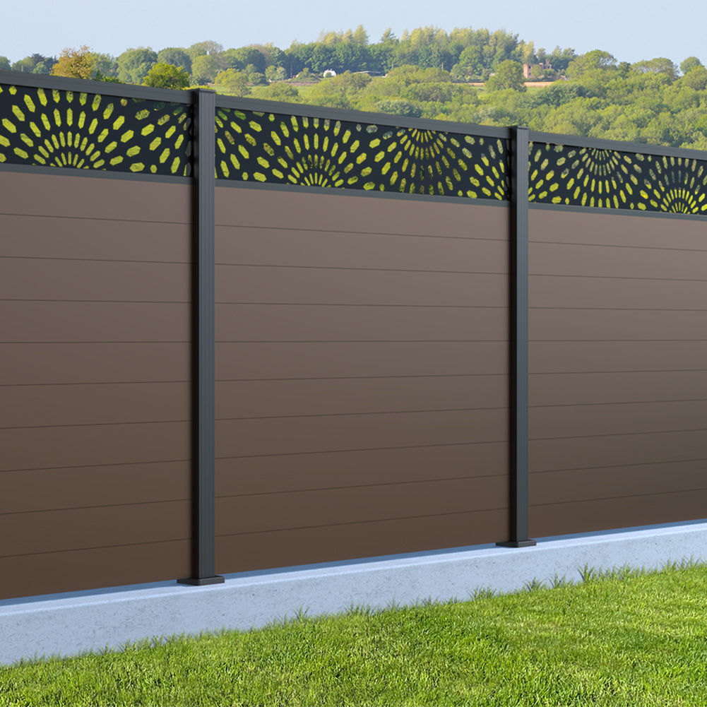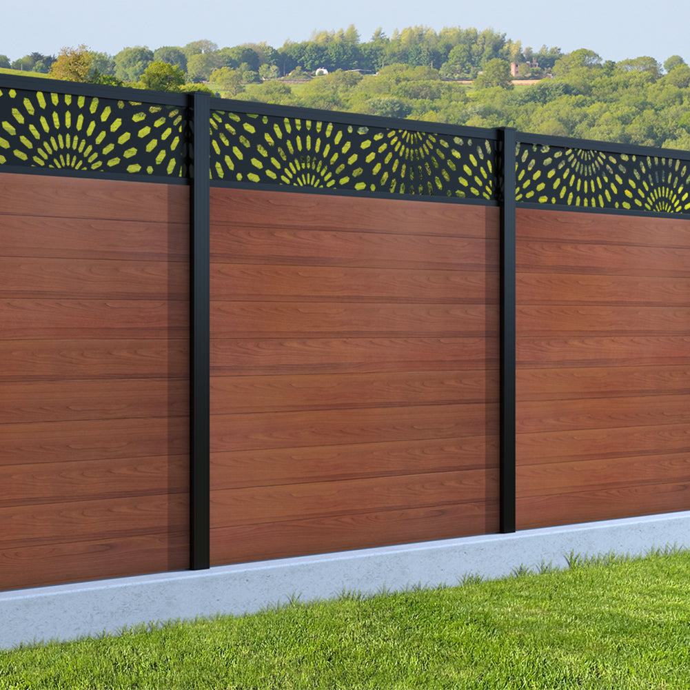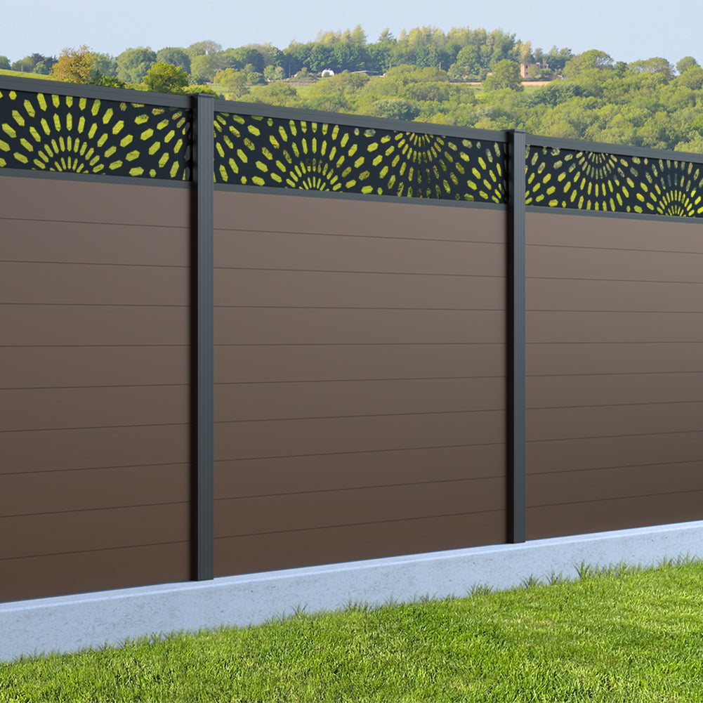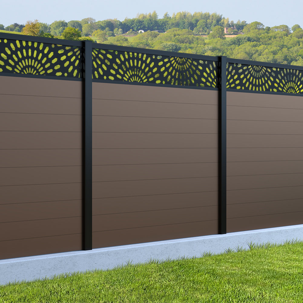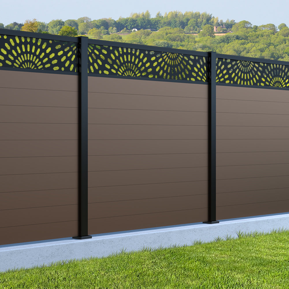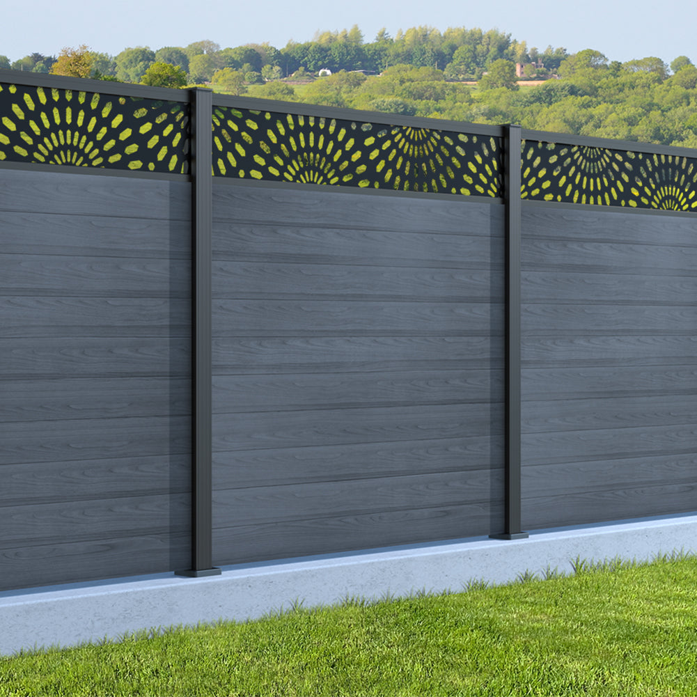 Fence your garden in style with our Sunburst Trellis Aluminium Fence Panels. Designed for modern outdoor spaces, this decorative aluminium garden fencing combines sleek horizontal boards with a stylish laser cut sun design to create a contemporary and private garden boundary.
